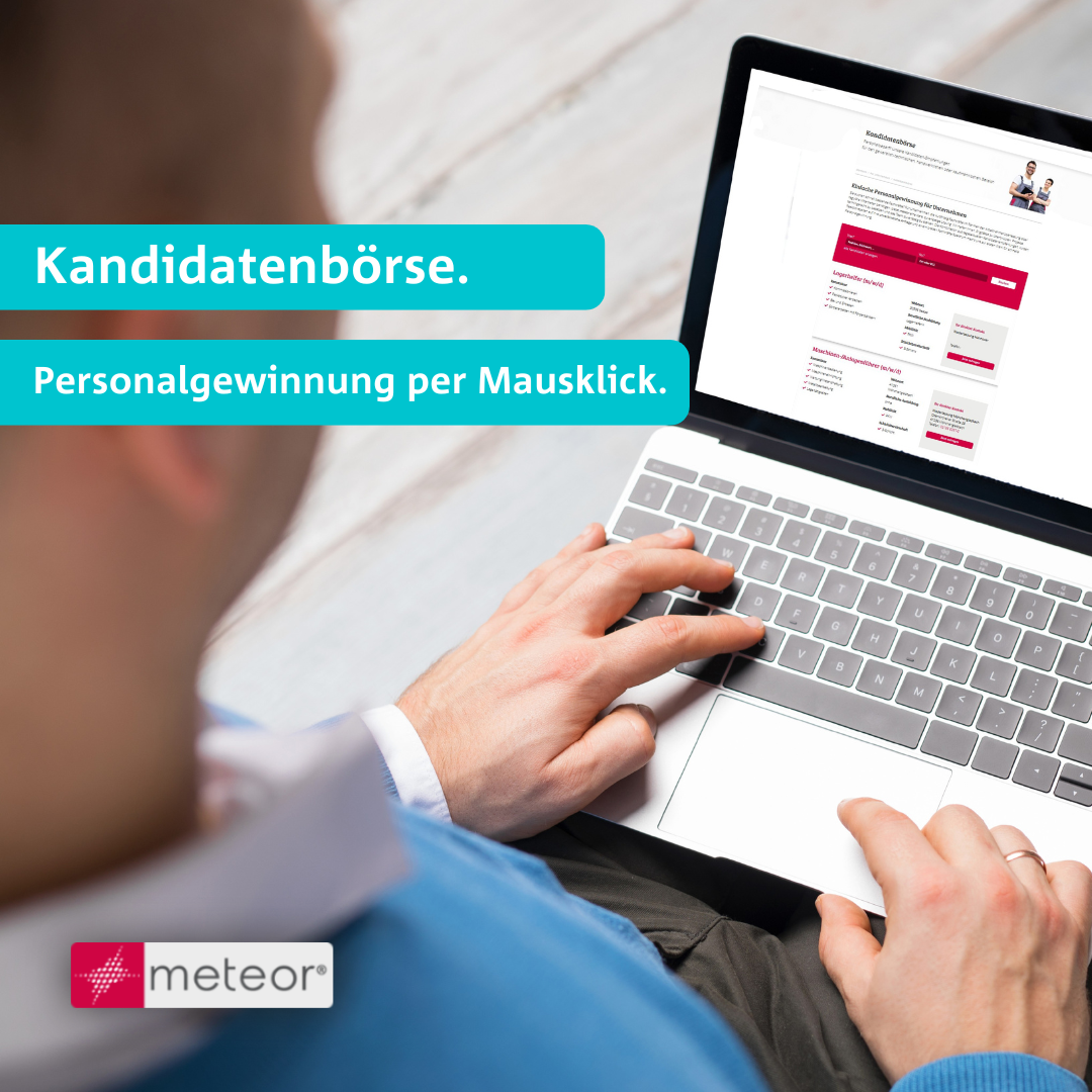 Mit der meteor Kandidatenbörse wird Personalgewinnung digital, direkt und effizient. Täglich ausgewählte und aktualisierte Fachkräfteprofile, kurzfristige Verfügbarkeit und eine einfache, unverbindliche Anfragefunktion machen sie zu einem einzigartigen Werkzeug für Unternehmen jeder Größe. Wer Fachkräfte sucht, findet sie hier – per Mausklick.